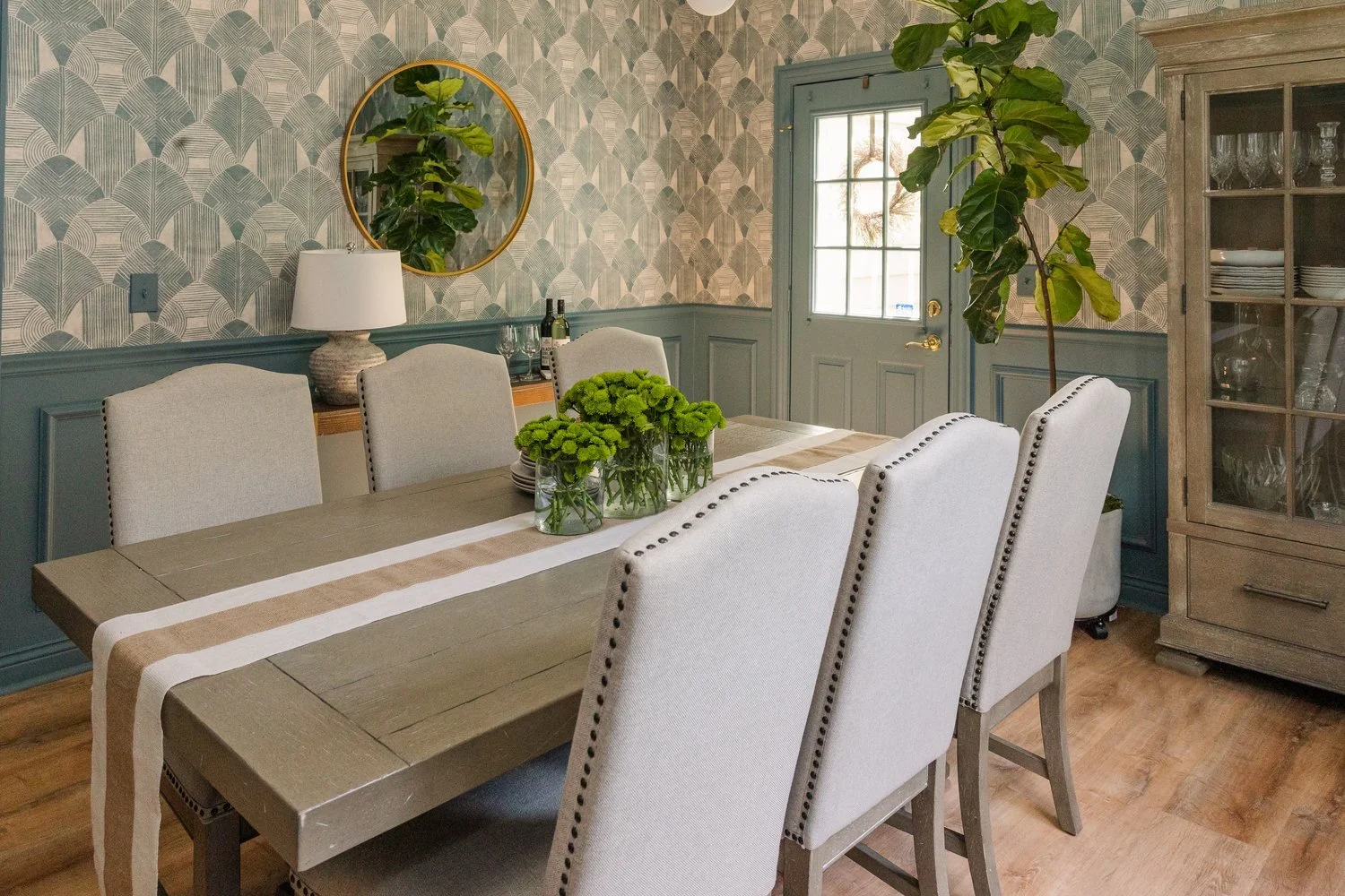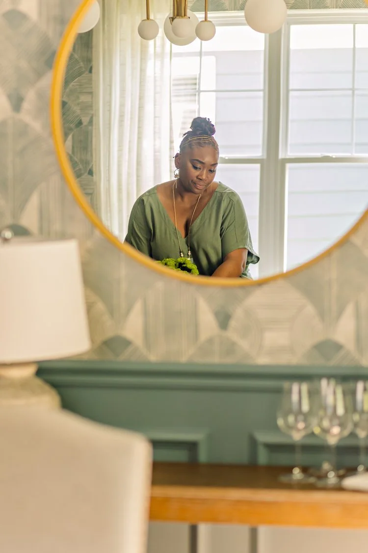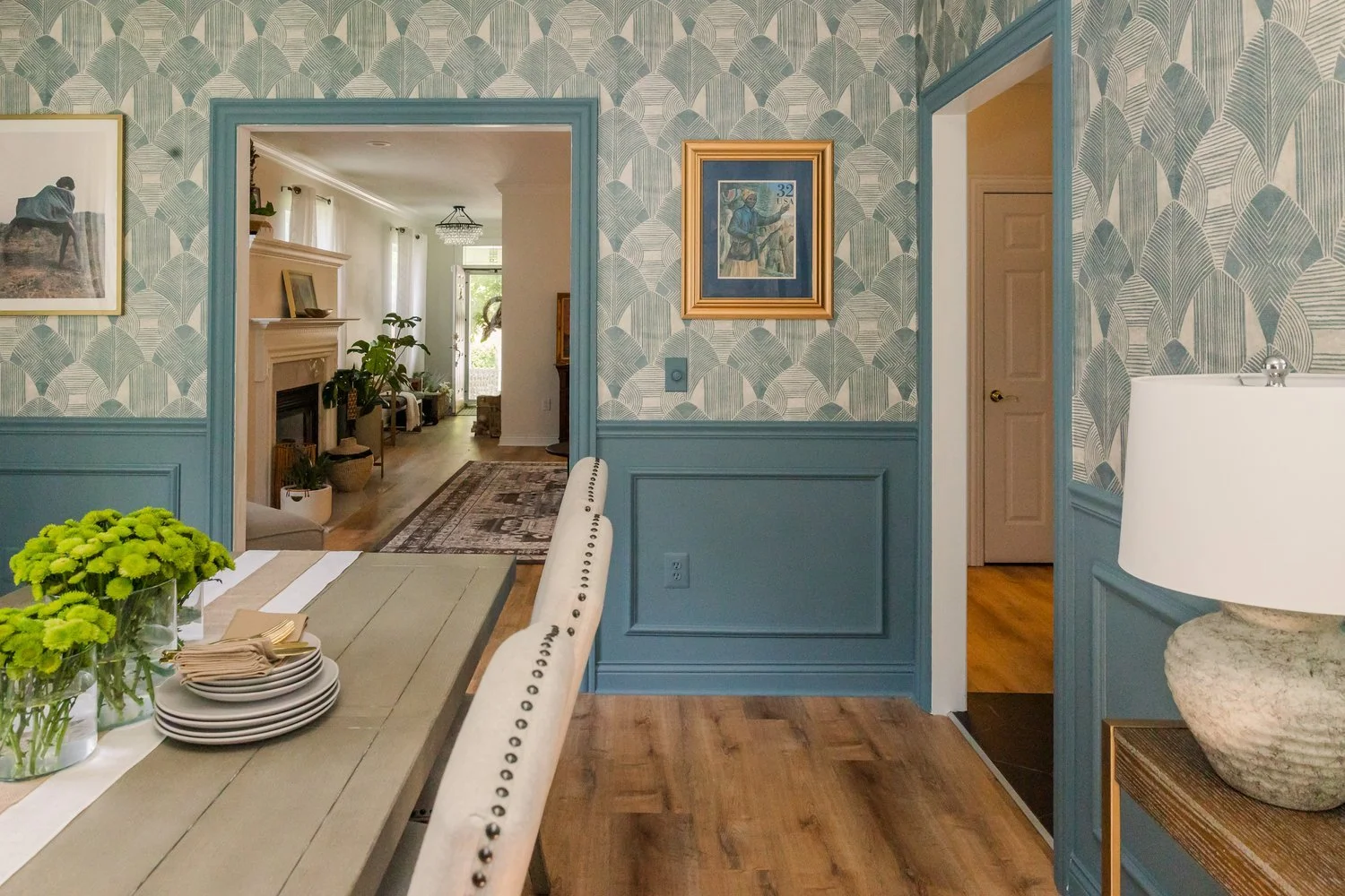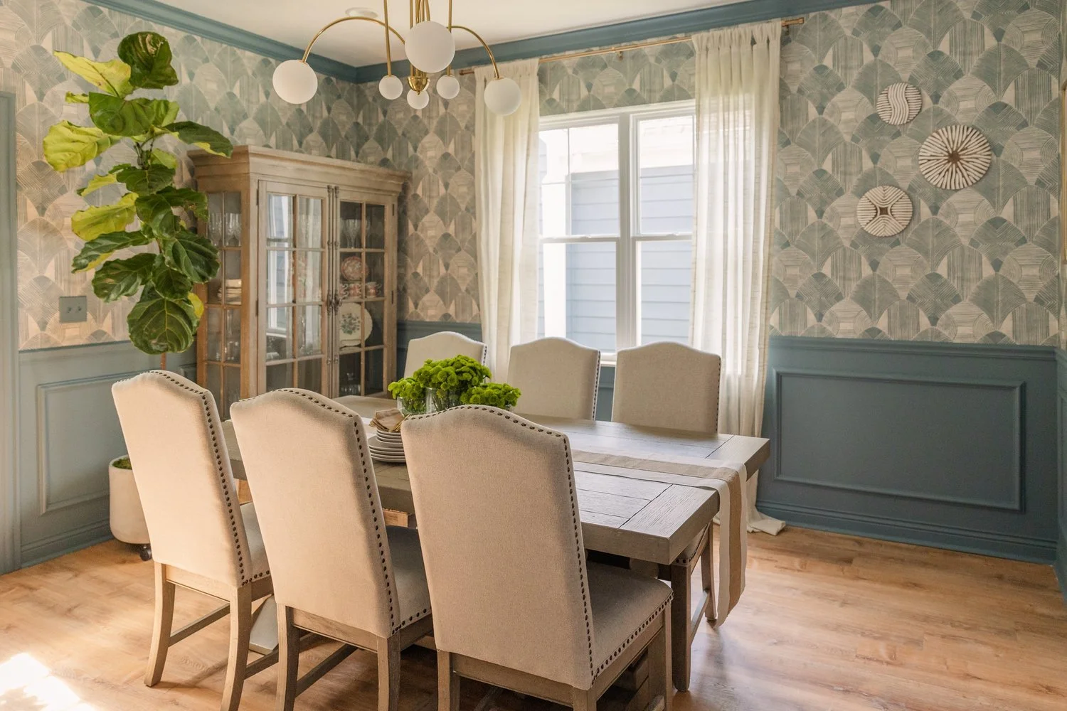 Beyond the new wainscoting, this Scott Living wallpaper was giving LIFE, (Johnathan and Drew call me! lol) and I paired it perfectly with the paint color Blustery Sky by Sherwin Williams. Speaking of wallpaper and paint… let me tell you about the pivot I pulled at the last minute. I insisted that the back door, cased openings, AND crown moulding had to be painted the same color blue; that they just couldn’t be white. Let me tell you that whenever I’ve felt a pivot like that in my spirit, I must follow it, and I’m so glad I did. The best part? I was able to paint all those areas prior to the wallpaper being installed with the help of my assistant Brittany. The artwork in the space had to exude feminine energy, including the Sojourner stamp print and the beautiful “Anu” photo print by the talented Obinna Obioma. In terms of greenery, I visualized a dynamic plant presence by way of one wall fiddle leaf fig, which complemented the other colors in the space. All other elements of the space were styled perfectly. See the After photos below.