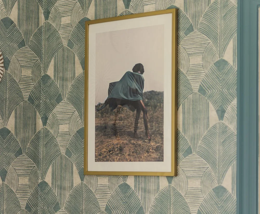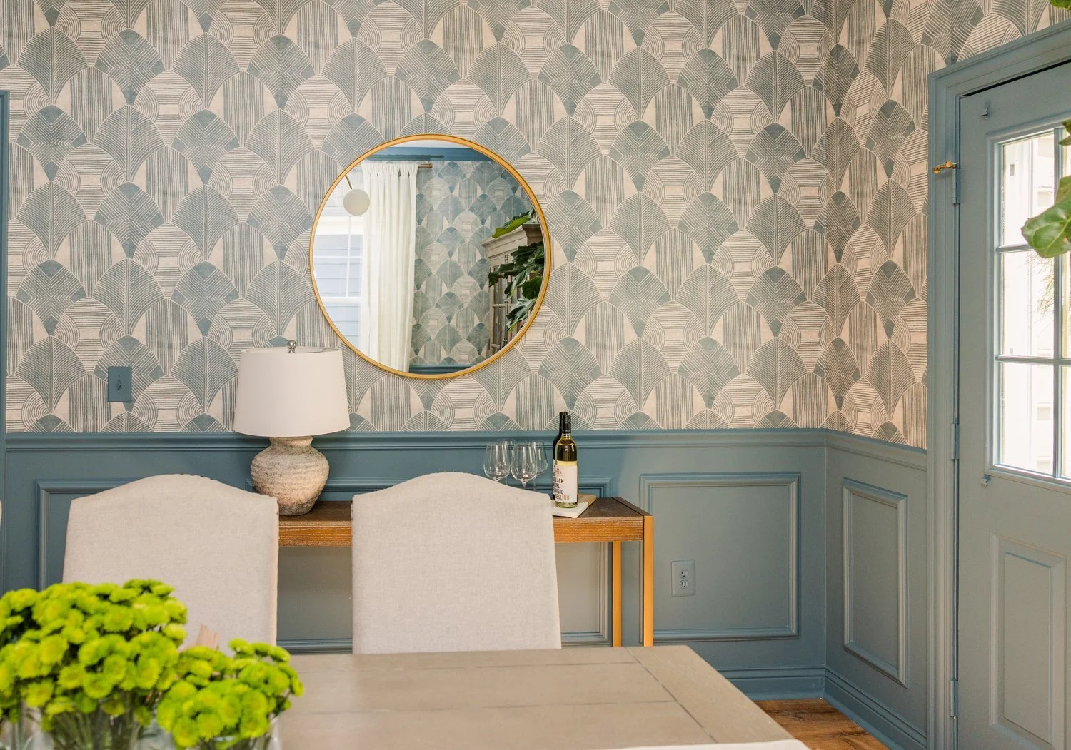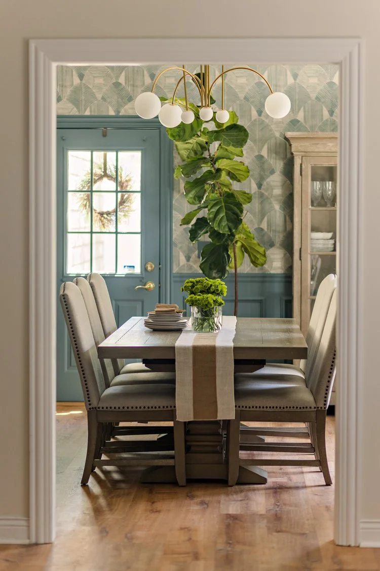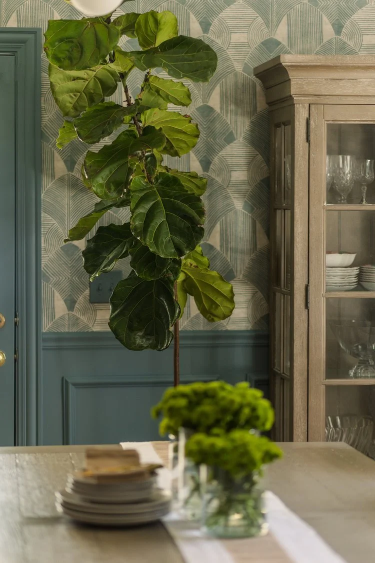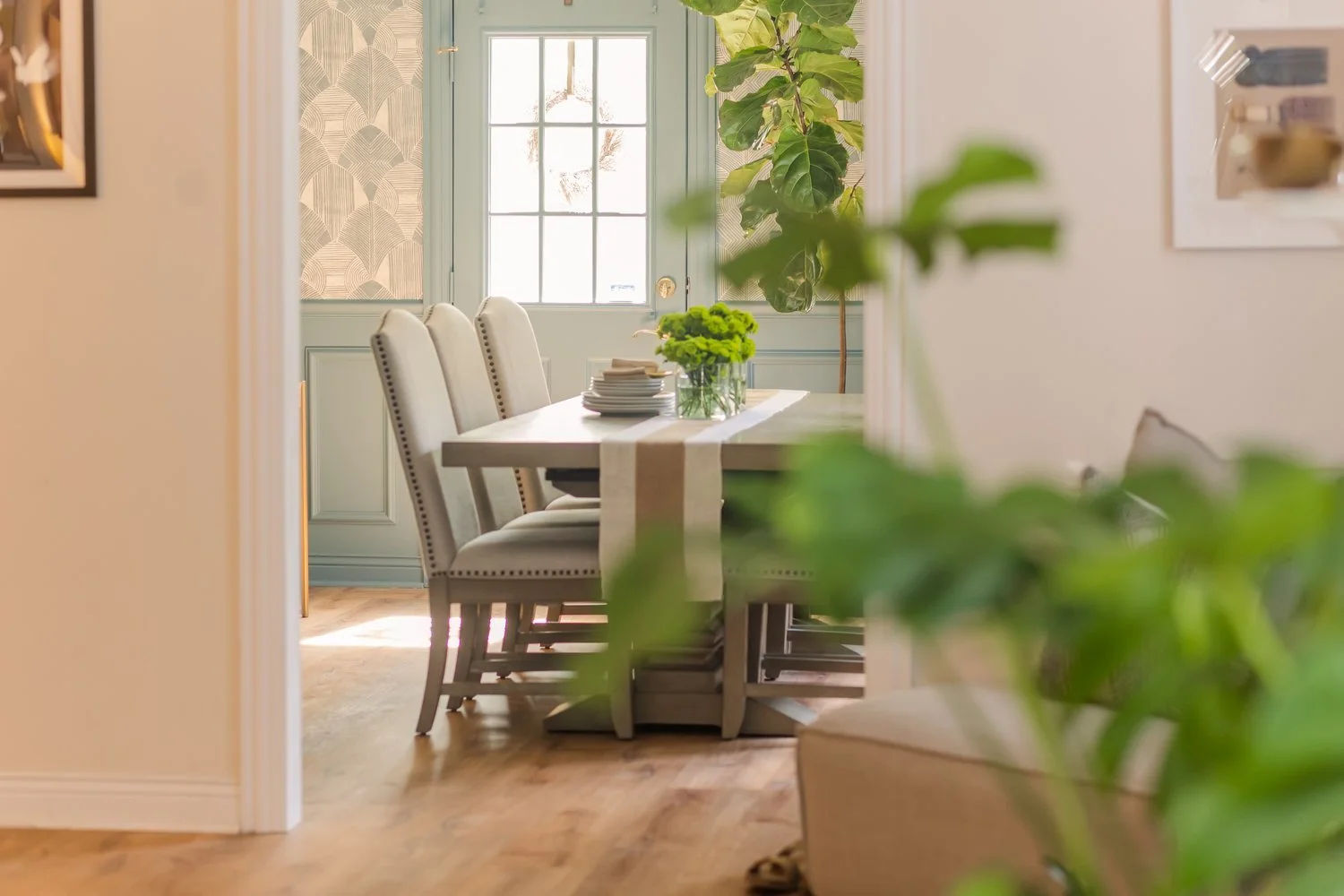 Beyond the new wainscoting, this Scott Living wallpaper was giving LIFE, (Johnathan and Drew call me! lol) and I paired it perfectly with the paint color Blustery Sky by Sherwin Williams. Speaking of wallpaper and paint… let me tell you about the pivot I pulled at the last minute. I insisted that the back door, cased openings, AND crown moulding had to be painted the same color blue; that they just couldn’t be white. Let me tell you that whenever I’ve felt a pivot like that in my spirit, I must follow it, and I’m so glad I did. The best part? I was able to paint all those areas prior to the wallpaper being installed with the help of my assistant Brittany. The artwork in the space had to exude feminine energy, including the Sojourner stamp print and the beautiful “Anu” photo print by the talented Obinna Obioma. In terms of greenery, I visualized a dynamic plant presence by way of one wall fiddle leaf fig, which complemented the other colors in the space. All other elements of the space were styled perfectly. See the After photos below.