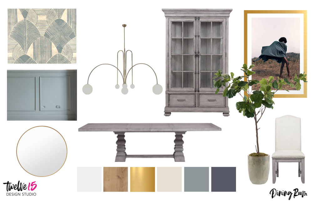 C’mon you guys, the mood board simply speaks for itself. But seriously, let’s talk about it. The main feature is the wallpaper, I mean, look at it! The furniture was the existing furniture from her dining room renovation that I completed in her previous home. The feeling I was looking to evoke in this new dining room was an audible GASP, seriously, I wanted people to gasp in awe at how stunning the space is… this mood board made me feel like that was very achievable.