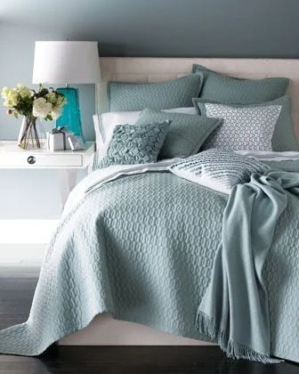 I like pillows, + lots of them make your bed look more cozy + inviting. And you know what I say about a cozy bed! Wait… you don’t??? Well, ask me later! *hee hee* You want to look for a pillow with a tightly woven outer fabric. You also want to ensure that you have the right inserts for your pillows, too. Nothing looks sloppier than a saggy + wrinkled pillow sham. In terms of aesthetics, the best looking inserts are down-filled, + although they can be on the pricey side, they will ALWAYS make your pillows look amazing, talk less feel awesome, too. Really, there are no “rules” when it comes to selecting pillows, but an easy technique is to match standard or king pillows to your duvet + euro shams to your quilt or coverlet. This is if you like more “order” to the patterns + colors on your bed.