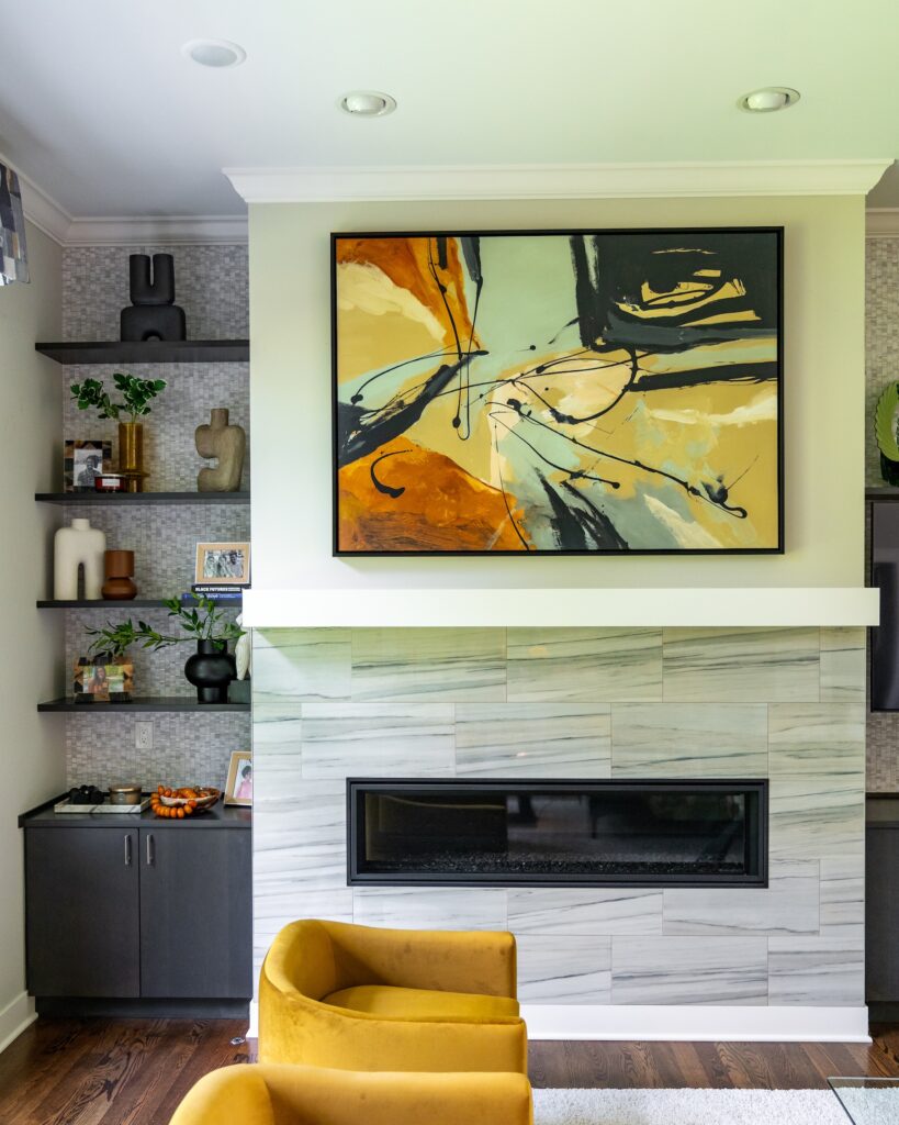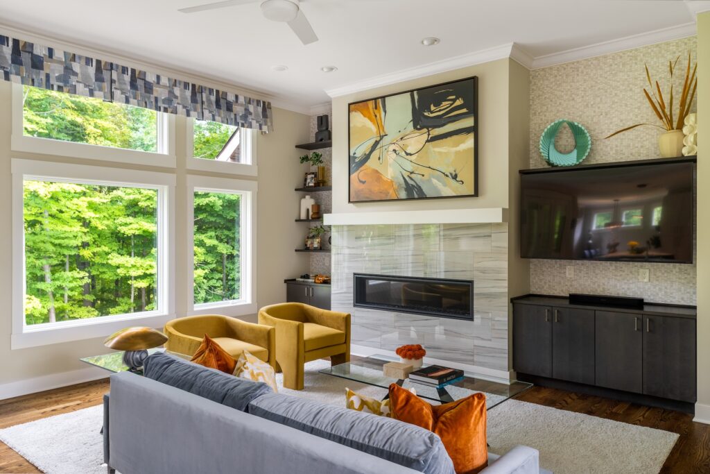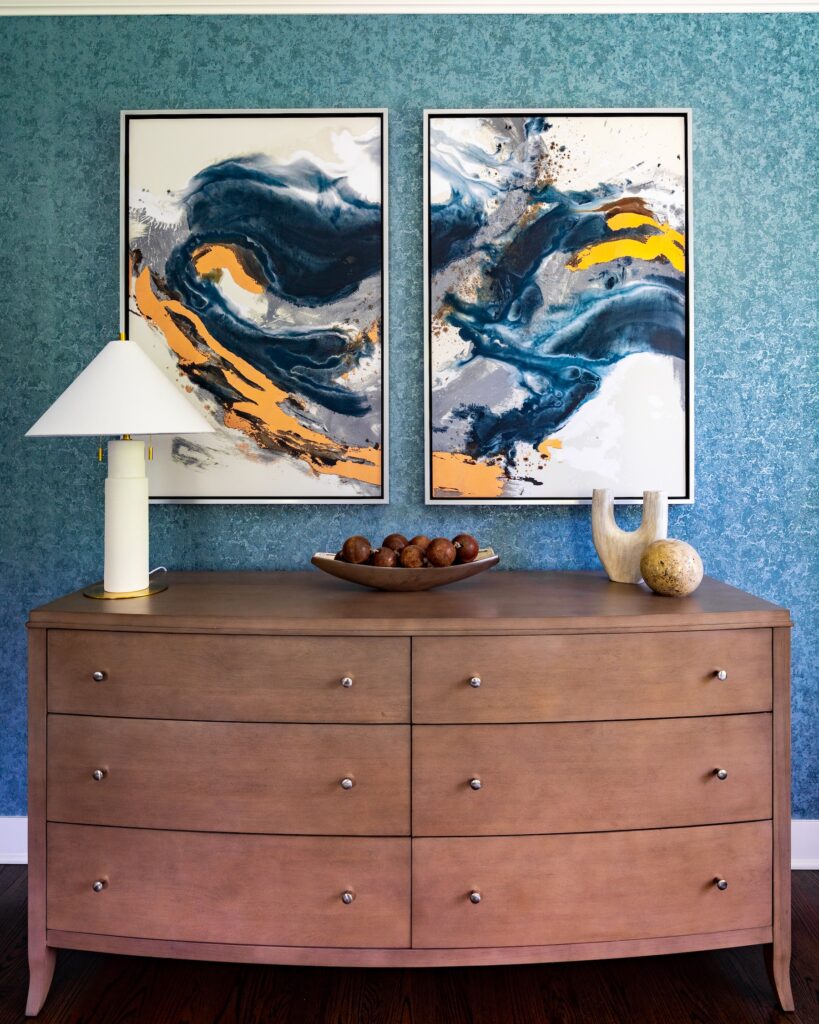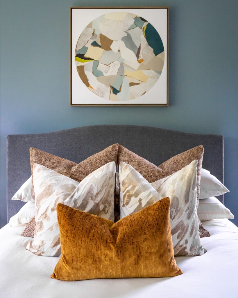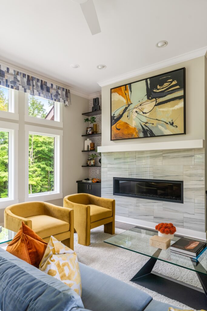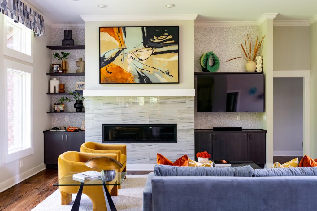 Project Brief: Our design intent was to transform a blank-slate new construction home into a Sophisticated, Elegant, and Relaxing environment, styled after a luxury hotel lobby. The aesthetic, defined as Artful Elegance, was achieved by utilizing bold accent colors (blues and golds) against neutral walls, prioritizing comfortable furnishings, and integrating unique, non-generic pieces of art. A bold and vibrant art curation was central to add character. Functional updates included custom valances throughout to maximize natural light and views, and incorporating solutions for display and storage in the Great Room. The design successfully integrated the clients’ existing furniture, with a few new pieces, to achieve a tailored, high-end finish.