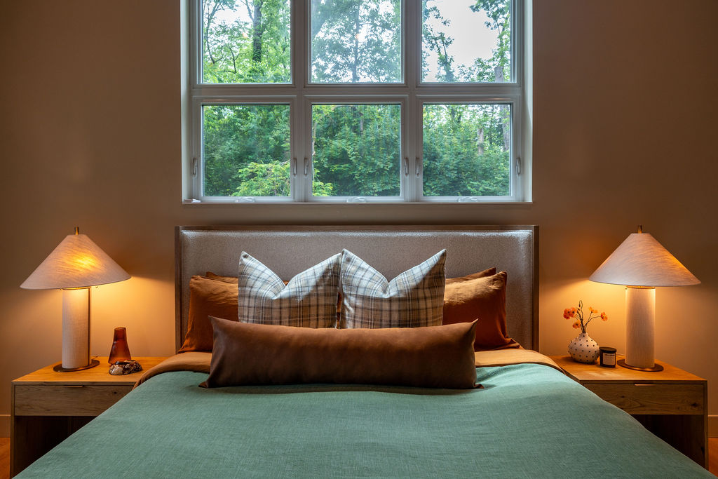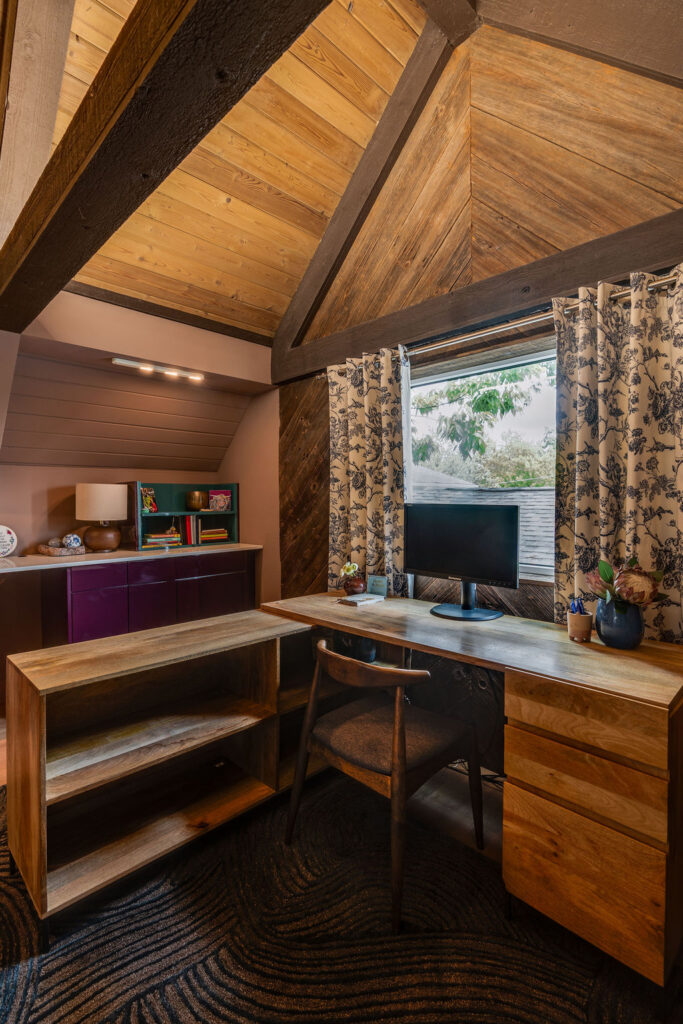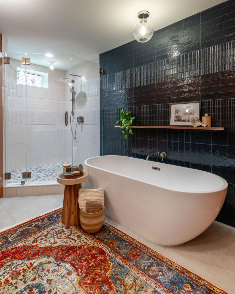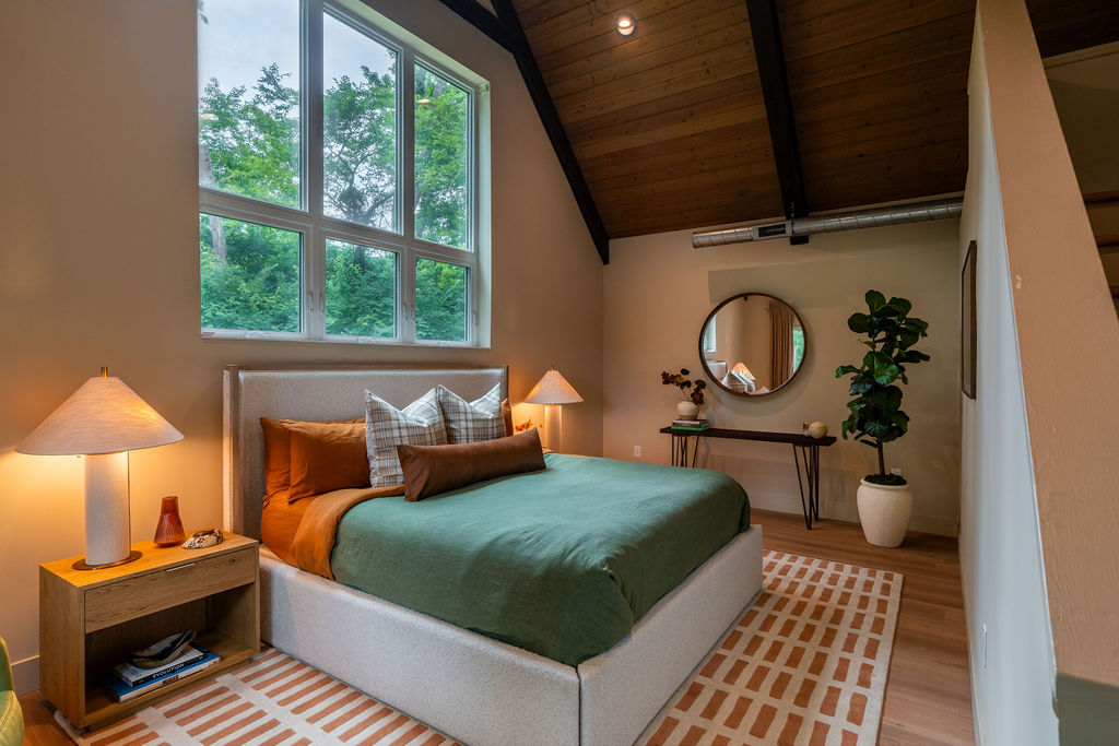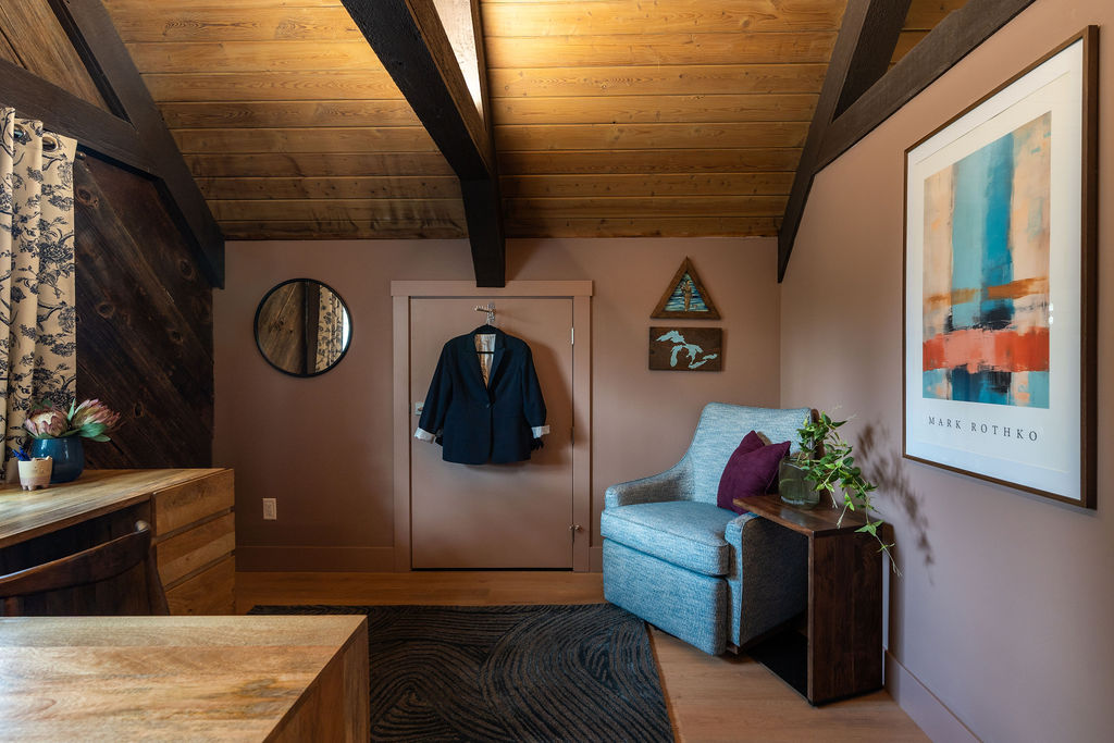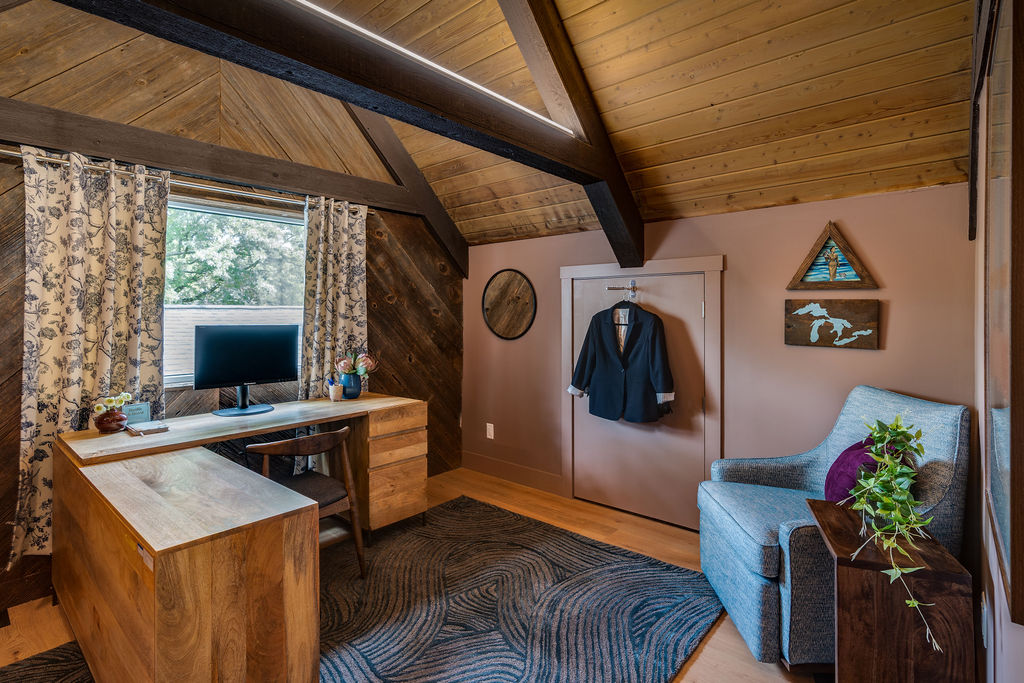 Project Brief: A full-service interior design and major renovation of a 1967 single-family residence, executed in partnership with Trilobite Design. Our design intent was to transform the home from inherited furnishings to a cohesive, comfortable, and stylish sanctuary that reflects the clients’ outdoorsy, practical lifestyle. The aesthetic is a blend of Bohemian and Nature-Inspired Modern, prioritizing comfort and a seamless visual connection to the surrounding environment. The design utilizes a tranquil palette of blues, greens, and earth tones. The Primary Suite was converted into a spa-like retreat, featuring a freestanding tub and fabric-accented bedroom. The Home Office Loft was updated to be optimized for virtual meetings, balancing existing wood paneling with modern lighting and functional accent seating. Architectural upgrades focused on high R-value exterior walls, a metal standing seam roof, and a new heat pump/ERV system for optimal efficiency and year-round comfort.