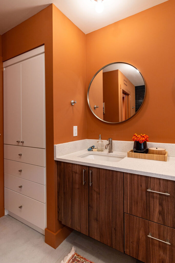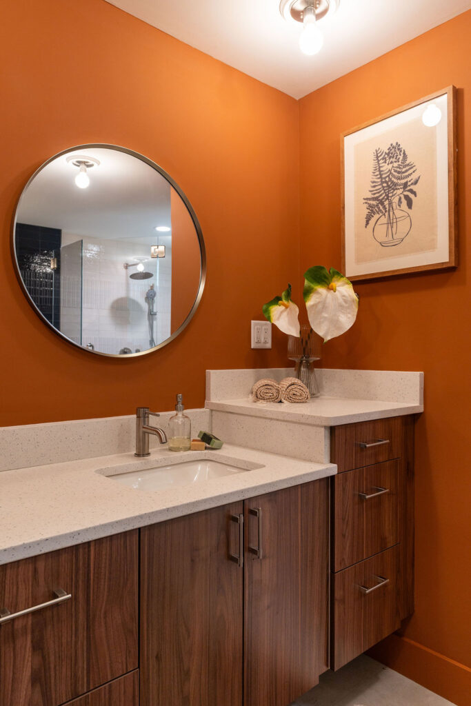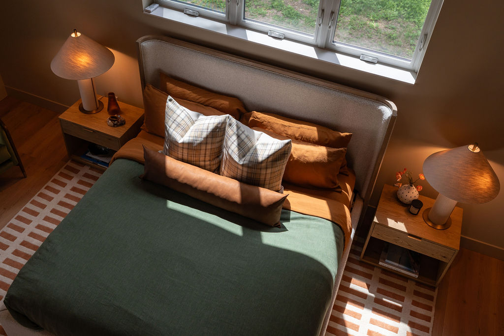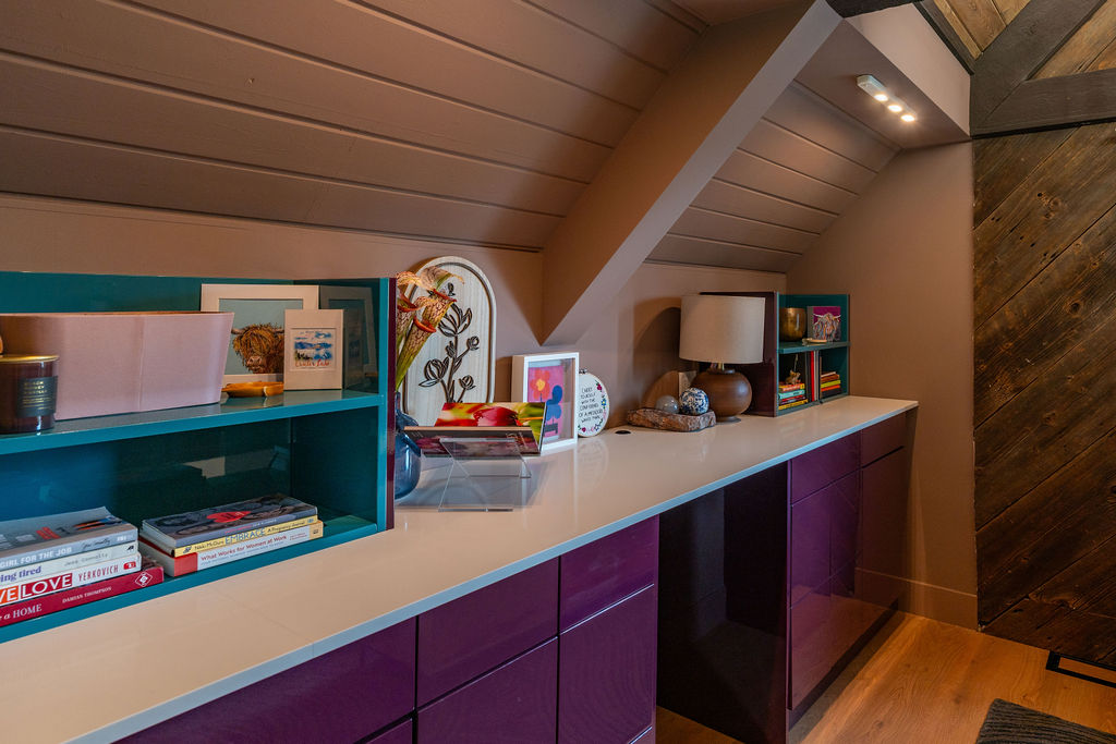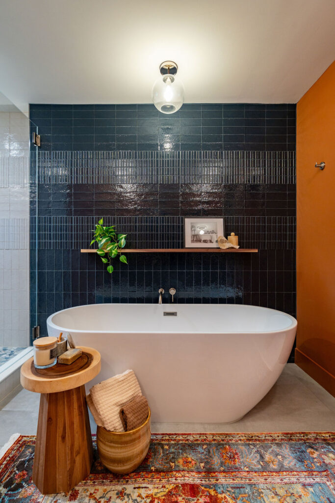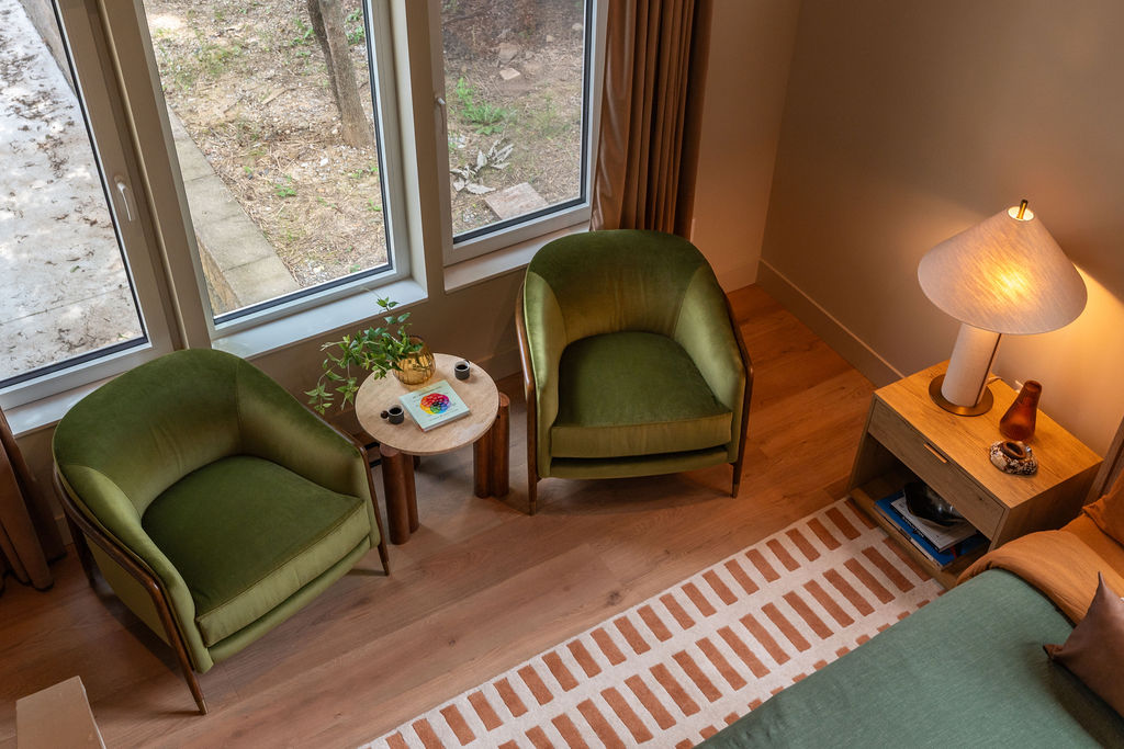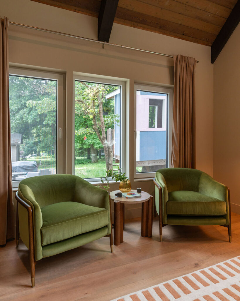 Project Brief: A full-service interior design and major renovation of a 1967 single-family residence, executed in partnership with Trilobite Design. Our design intent was to transform the home from inherited furnishings to a cohesive, comfortable, and stylish sanctuary that reflects the clients’ outdoorsy, practical lifestyle. The aesthetic is a blend of Bohemian and Nature-Inspired Modern, prioritizing comfort and a seamless visual connection to the surrounding environment. The design utilizes a tranquil palette of blues, greens, and earth tones. The Primary Suite was converted into a spa-like retreat, featuring a freestanding tub and fabric-accented bedroom. The Home Office Loft was updated to be optimized for virtual meetings, balancing existing wood paneling with modern lighting and functional accent seating. Architectural upgrades focused on high R-value exterior walls, a metal standing seam roof, and a new heat pump/ERV system for optimal efficiency and year-round comfort.